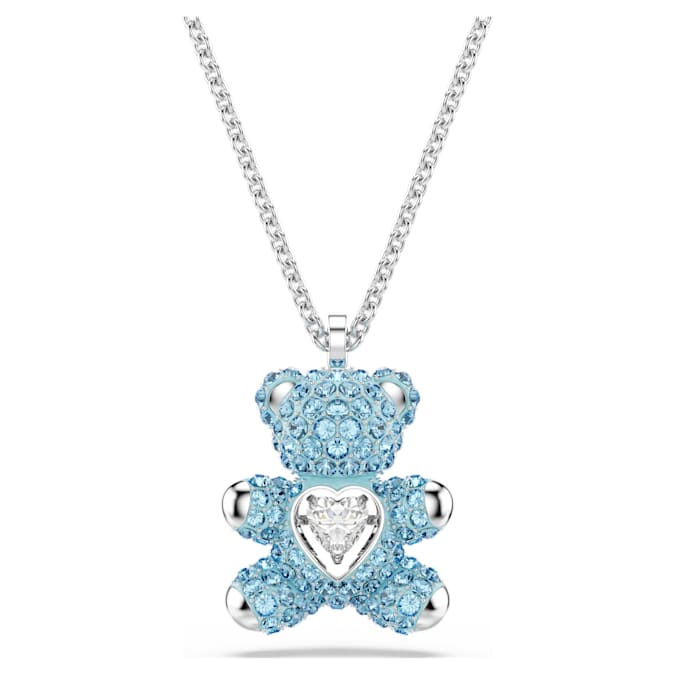 Inspire a smile with this playful pendant. The 3D teddy is covered in blue crystal Pointiage® and holds a heart-shaped dancing stone in a clear tone. Finished with a rhodium plated chain, this unique design encapsulates happiness and love.